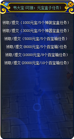 上线到韦大宝NPC处点击(确认任务)选择【5000元宝、5个百宝箱】任务